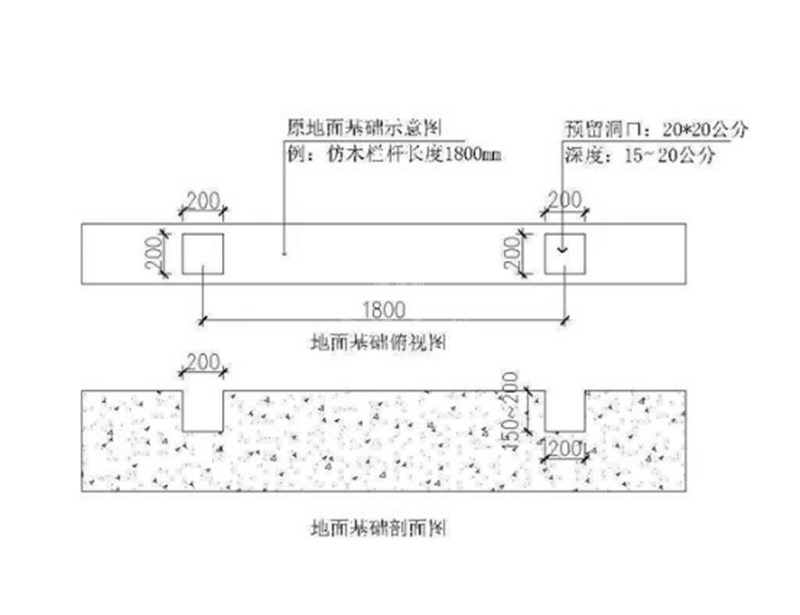 本产品立柱直径15公分,需预留直径25公分左右的孔,根据现场台阶高度做外径40公分左右的水泥墩,以确保安装完栏杆的牢固性。